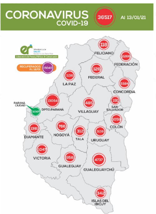 En el departamento Uruguay informaron 9 casos, (información que será ampliada en las próximas horas porque se esperaban los resultados de más estudios, e incluso podrían ser incluidos en el informe de mañana jueves).