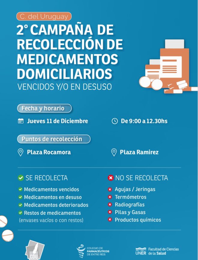 La propuesta continúa el trabajo conjunto entre el Colegio de Farmacéuticos de Entre Ríos (COFAER), el Programa de Salud Colectiva de la Facultad de Ciencias de la Salud (UNER) y la Municipalidad de Concepción del Uruguay, promoviendo acciones responsables para proteger la salud y el ambiente.