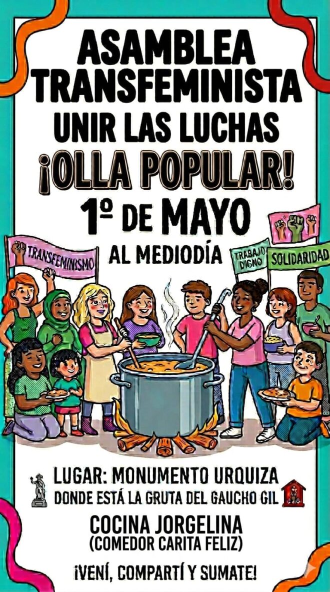 En el marco del Día Internacional de los Trabajadores y las Trabajadoras, la Asamblea Transfeminista, conformada por diversas agrupaciones locales, invita a toda la comunidad a participar de una Olla Popular bajo la consigna "Unir las luchas".