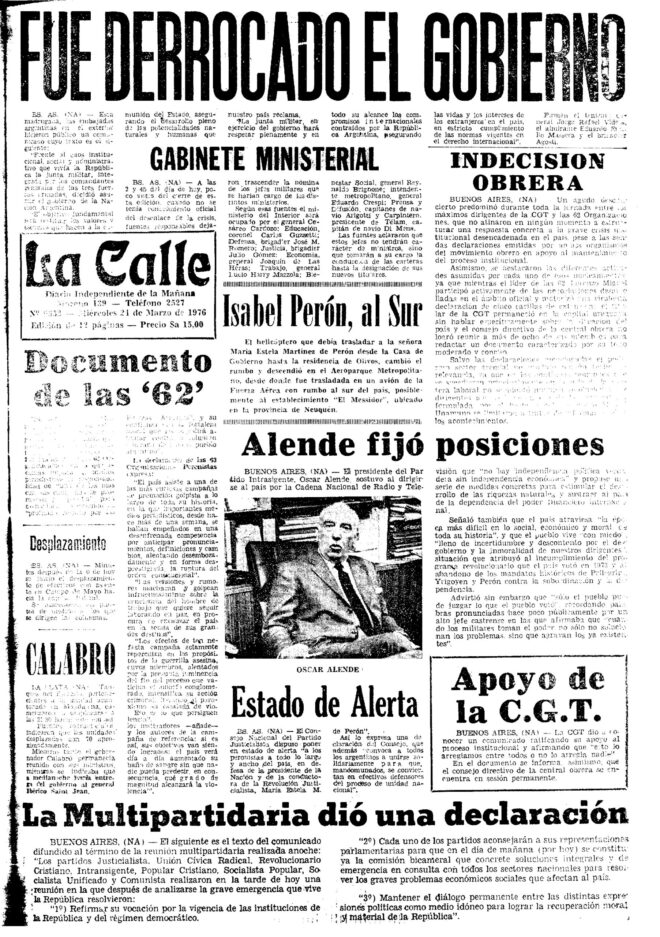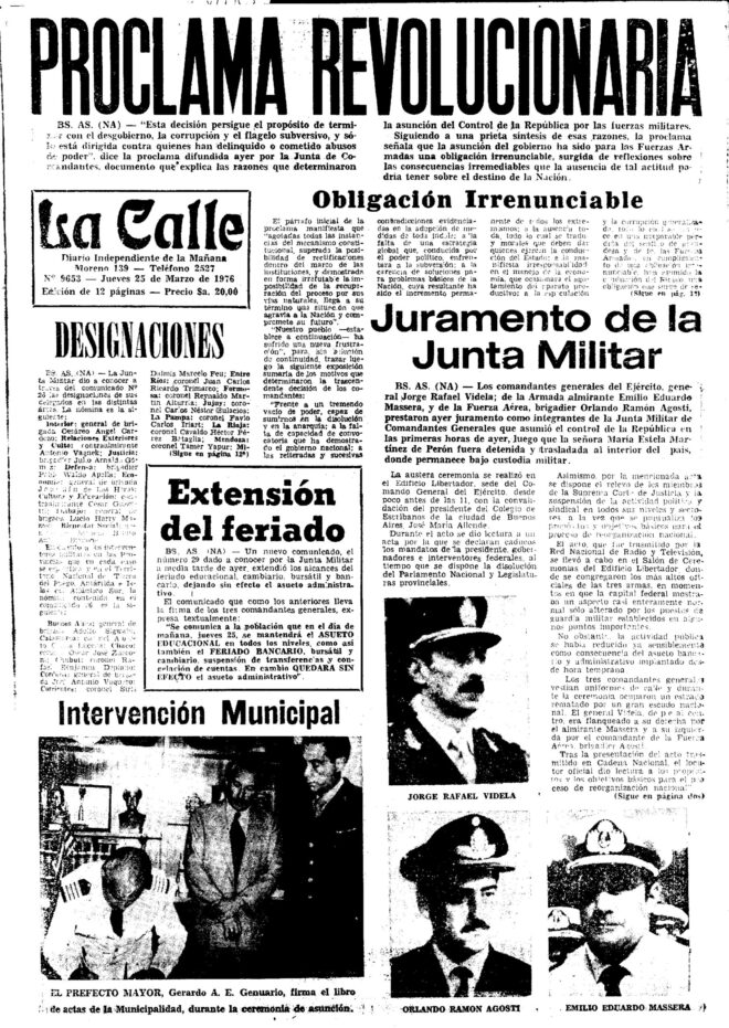 La edición de La Calle del miércoles 24 de marzo de 1976 no ilustra demasiado acerca de los sucesos acaecidos en los primeros minutos del día. “Fue derrocado el gobierno”, destaca el titular más importante, haciendo público un comunicado distribuido por las embajadas argentinas en el exterior. El mismo, con las firmas del “Teniente General Jorge Rafael Videla, el Almirante Eduardo Emilio Massera y el Brigadier Agosti”, informaba que “frente al caos institucional, social y administrativo que vivía la República, la junta militar (…) decidió asumir el gobierno de la Nación Argentina”.