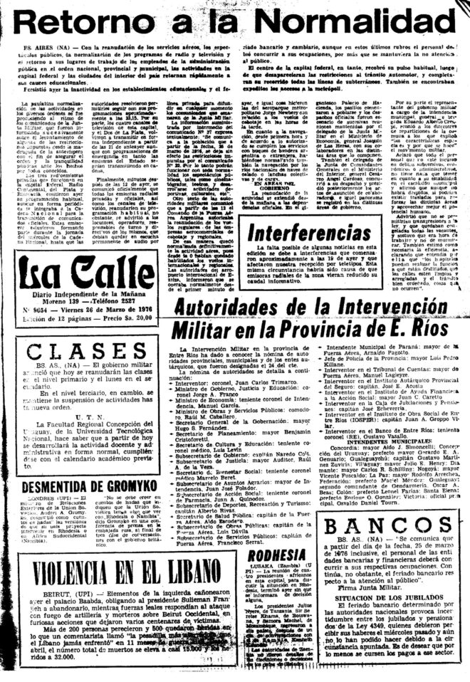 La nómina completa de las autoridades de la Intervención Militar en la provincia y el anuncio de que con normalidad se dictarán clases en los niveles primario y secundario y de igual manera se trabajará en las entidades bancarias y financieras. En el interior también de a poco se vuelve al ritmo habitual, con pocas noticias acerca de los cambios operados en el país. Acerca de la situación en la ciudad en otras páginas también es escueto el material.