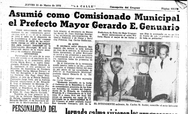 Genuario, designado “Comisionado Municipal”, había asumido en una ceremonia cumplida “a las 10 de la mañana en el despacho de la Intendencia”, donde se realizó “el traspaso de funciones de parte de las autoridades electas en 1972 a las designadas para cumplir funciones en la Intervención Municipal”.
