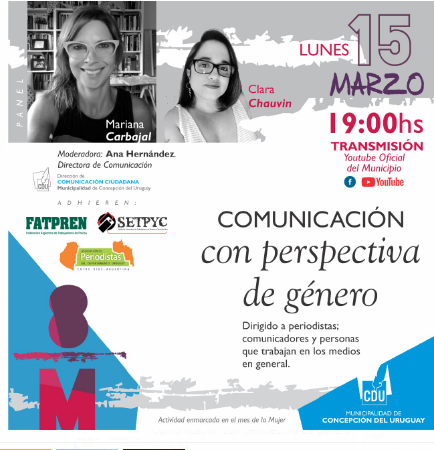 En el marco del Mes de la Mujer se realizará este lunes a las 19  un encuentro virtual de comunicación con perspectiva de género. Las exposiciones estarán a cargo de las periodistas Mariana Carbajal y Clara Chauvin, integrante de El Miércoles Digital y El Miércoles Comunicación y Cultura Cooperativa de Trabajo.