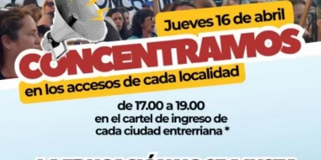 La Asociación Gremial del Magisterio de Entre Ríos (Agmer) convocó a una jornada de lucha para este jueves 16 de abril entre las 17 y las 19, que consistirá en concentraciones simultáneas en los ingresos a cada localidad entrerriana.