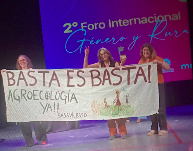 Después contó que “uno de los motivos por los que yo fui a recibir el premio, quería hablar unas palabras, pero bueno, no hubo micrófono para las ganadoras, pero yo me había llevado mi bandera nuestra bandera del ‘Basta es Basta’, y pude desplegarla. Como símbolo de nuestra lucha constante. Porque acá en el campo no es solamente hacer agroecología, sino que también es trabajar por un cambio de paradigma, un cambio de sistema productivo. El objetivo es tratar de construir entre todas y todos un espacio más saludable, un territorio más saludable y con soberanía alimentaria”, explicó la referente ambiental.