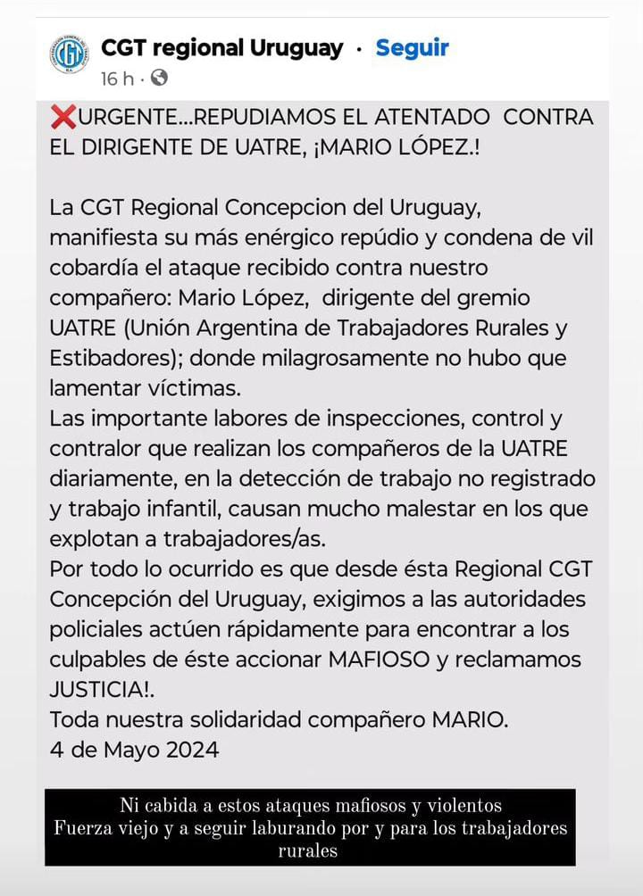 Fue en la noche de este 4 de mayo en el domicilio particular de Mario López, secretario general de la seccional Uruguay de la Unión de Trabajadores Rurales y Estibadores de la República Argentina (Uatre). El mismo sindicalista dijo a EL MIÉRCOLES dijo que estima que "fue por las inspecciones que se hacen en los establecimientos rurales".