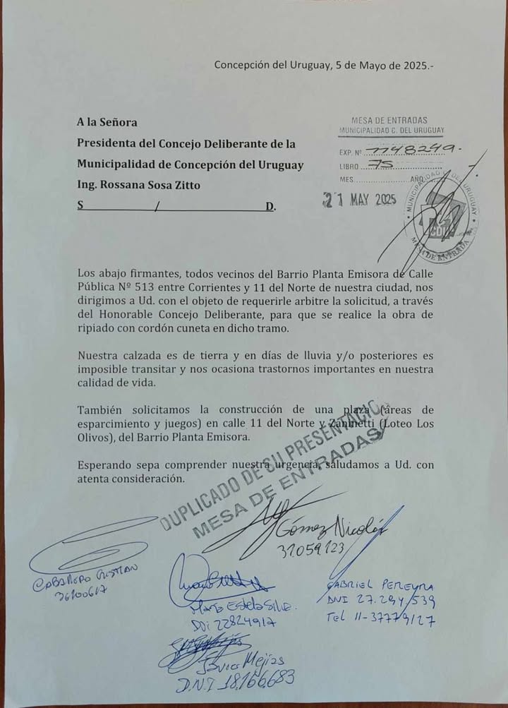 Además solicitan la construcción de una plazoleta con juegos para los chicos y chicas del barrio.