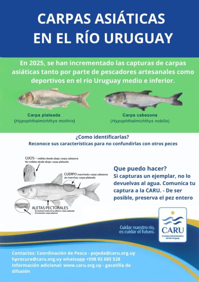 La Comisión Administradora del Río Uruguay (CARU) informó que durante el año 2025 se ha registrado un incremento en las capturas de carpas asiáticas en el tramo medio e inferior del río Uruguay, tanto por parte de pescadores artesanales como deportivos.
