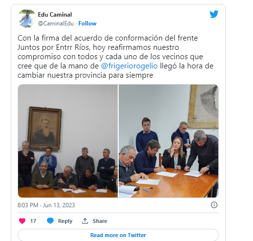 A la Unión Cívica Radical (UCR) y el PRO se suman el partido GEN, Nueva Generación Entre Ríos, el Movimiento Social Entrerriano y el partido Socialista. Además adhirieron partidos vecinales y agrupaciones. “Así, el frente que impulsa a Rogelio Frigerio como precandidato a gobernador quedó constituido y se convirtió en el más amplio del país”, dijeron al comunicar la noticia.