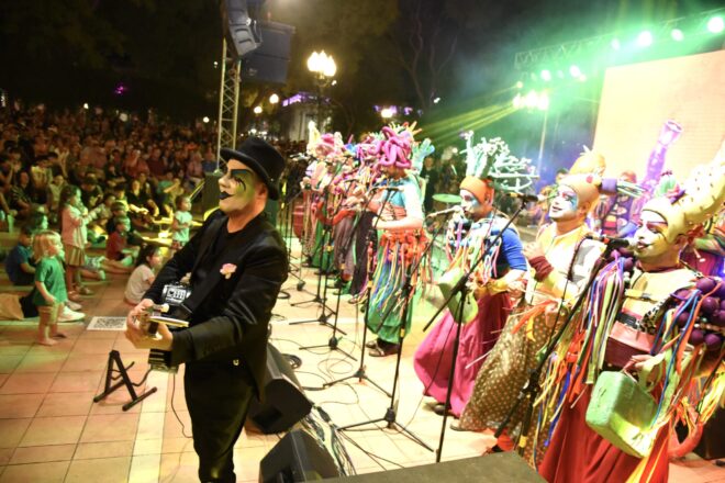 La jornada comenzó con la participación de las murgas locales Que mirá bobo y Los Puntuales Pa la tardanza, que aportaron identidad y tradición murguera a la previa del espectáculo central, reafirmando el fuerte vínculo cultural de la ciudad con este género.