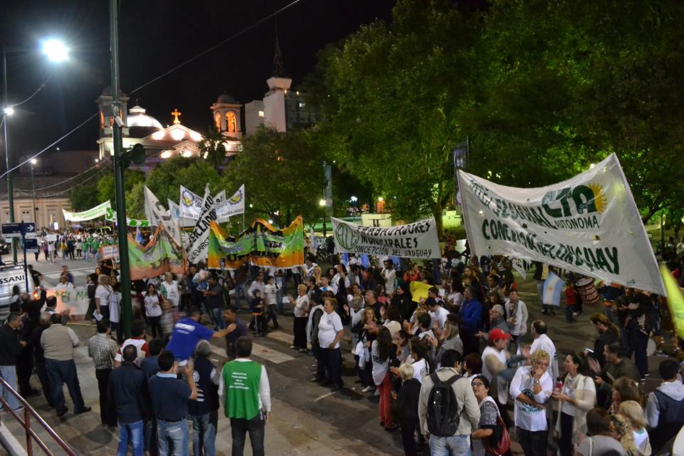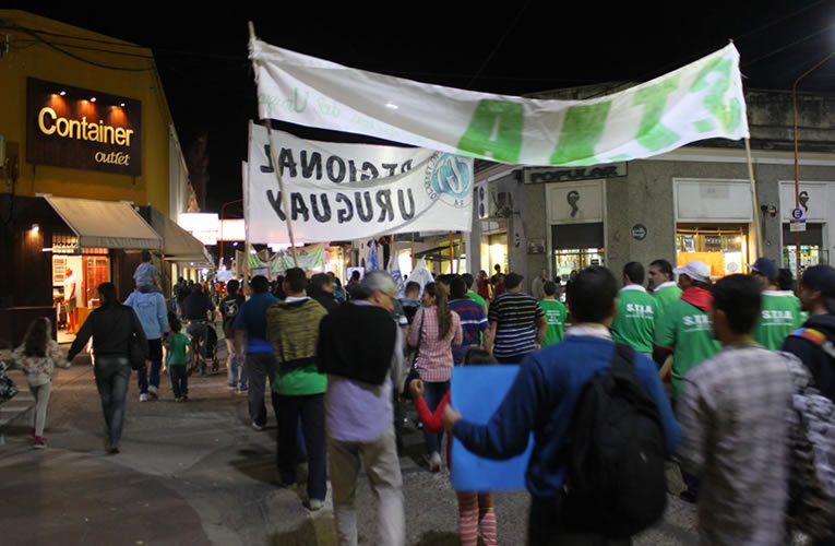 Aproximadamente unos mil trabajadores uruguayenses se dieron cita sobre calle San Martín, frente al Centro Cívico, en una marcha convocadas por los gremios locales enrolados en la Central de Trabajadores Argentinos (CTA) y la Confederación General del Trabajo (CGT).