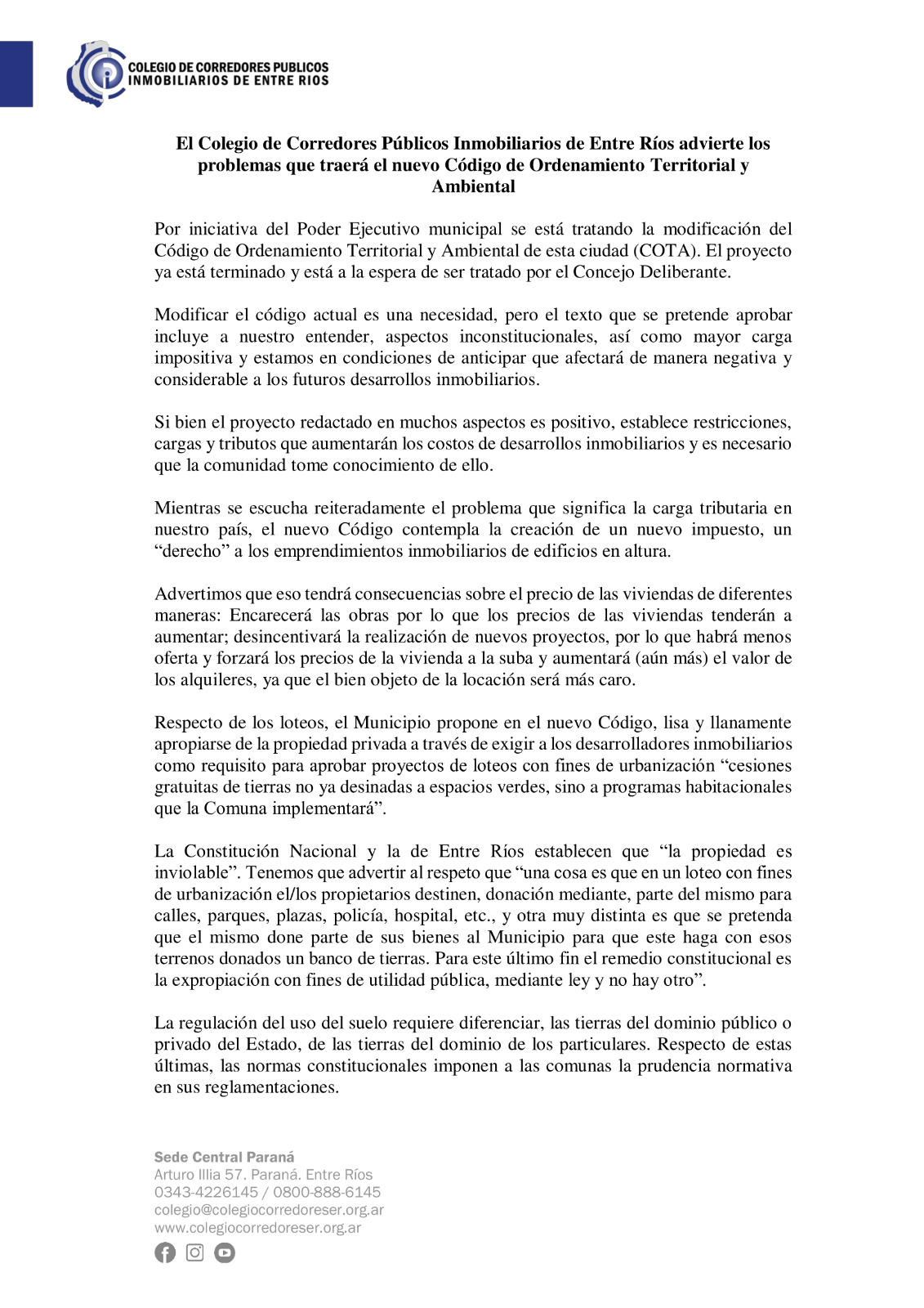 El comunicado enviado a esta redacción se titula “El Colegio de Corredores Públicos Inmobiliarios de Entre Ríos advierte los problemas que traerá el nuevo Código de Ordenamiento Territorial y Ambiental”. Comienza señalando que por iniciativa del Poder Ejecutivo municipal “se está tratando la modificación del Código de Ordenamiento Territorial y Ambiental de esta ciudad (COTA)”, que el proyecto ya está terminado y “a la espera de ser tratado por el Concejo Deliberante”.