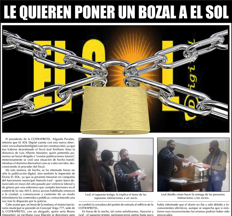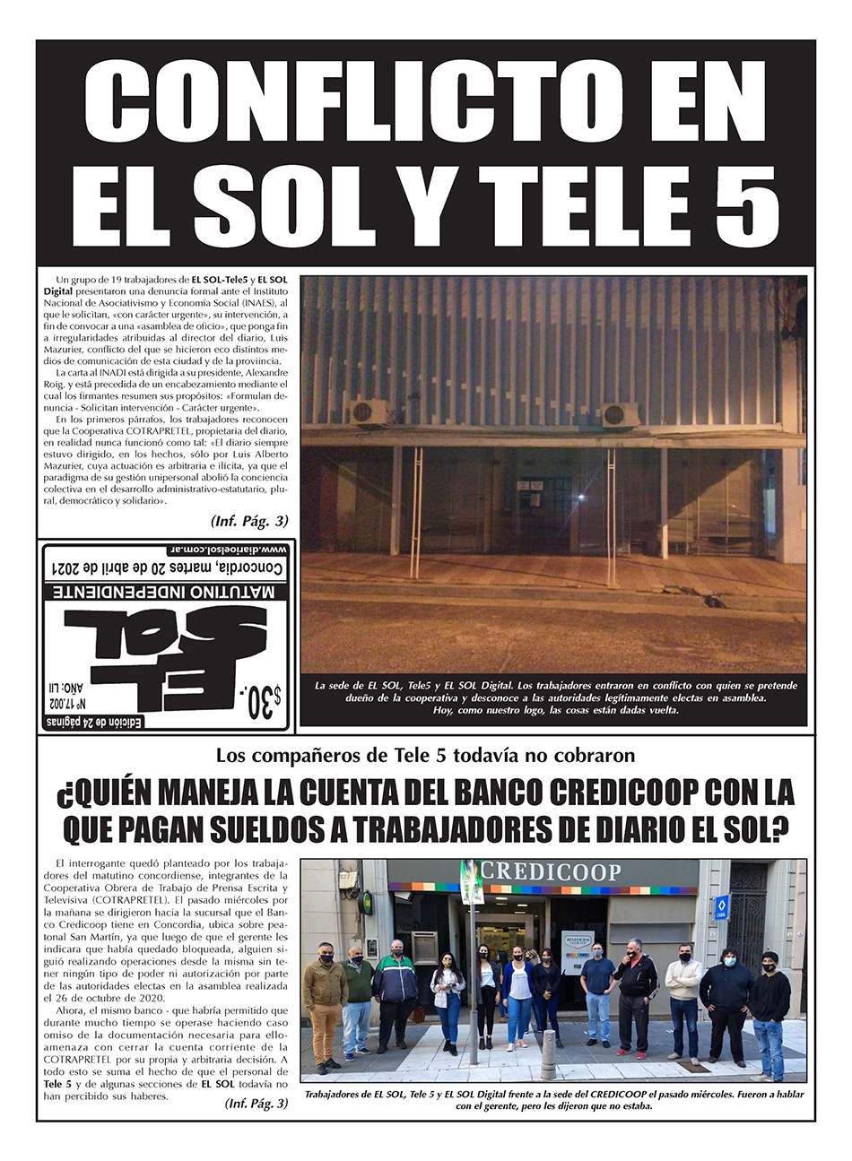 Los trabajadores además denuncian connivencia entre el gerente del banco cooperativo en esa ciudad y el titular de la “coopetrucha” sobre la cuenta bancaria. En la edición gráfica del matutino, con el título “¿Quién maneja la cuenta del banco Credicoop con la que pagan sueldos a trabajadores de diario El Sol?”, contaron que el gerente Luis Camutti les dijo que la cuenta “quedó bloqueada” el viernes 9 de abril.