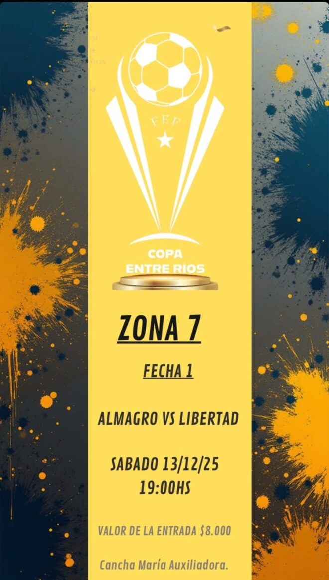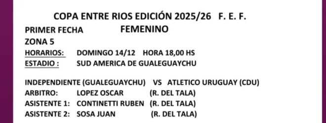 17.30: Cancha de Engranaje (Ejército de Los Andes y 20 del Oeste). Fútbol masculino de 1º división. Copa de Entre Ríos. 17.30: Engranaje (Concepcióndel Uruguay) vs. San Marcial (Liga Regional);