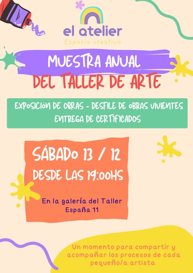 19: "El atelier espacio creativo" (España 11). Muestra anual. Valor de la entrada dos mil pesos.