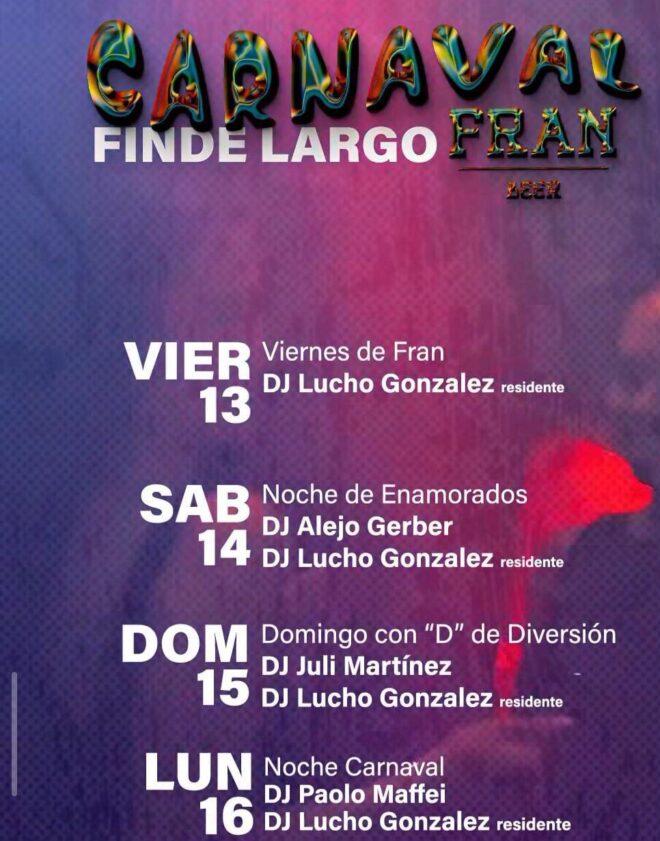 21: Predio Multieventos (Belgrano y Maipú). Carnavales de Concepción del Uruguay. Desfilaran como comparsas invitadas Mayita y Mi Ilusión, Comparsa Mascarada y, cerrando la noche Comparsa Urugua-í. (Ver nota).