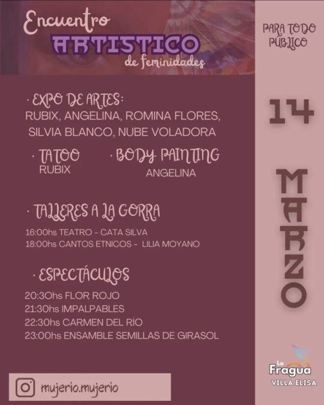 10.30: Centro Cultural La Fragua (Héctor de Elia 1489- Villa Elisa, departamento Colón). Se presentará "Mujerio vol. 6". Un evento cultural gestionado por artistas autoconvocadas, con el fin de visibilizar al arte de mujeres y disidencias, poniendo en valor su labor dentro de la comunidad. Incluye espectáculos, talleres, muestras de arte, feria de artesanas y emprendedoras, tatuajes y body paint. Instagram: @mujerio.mujerio (Ver más info en el siguiente flyer).
