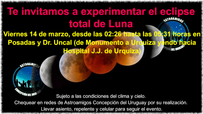 2.20: Posadas y Dr Uncal. Eclpise total de luna.el grupo Astroamigos Concepción del Uruguay organizó una jornada de observación.(Más info en el siguiente flyer).