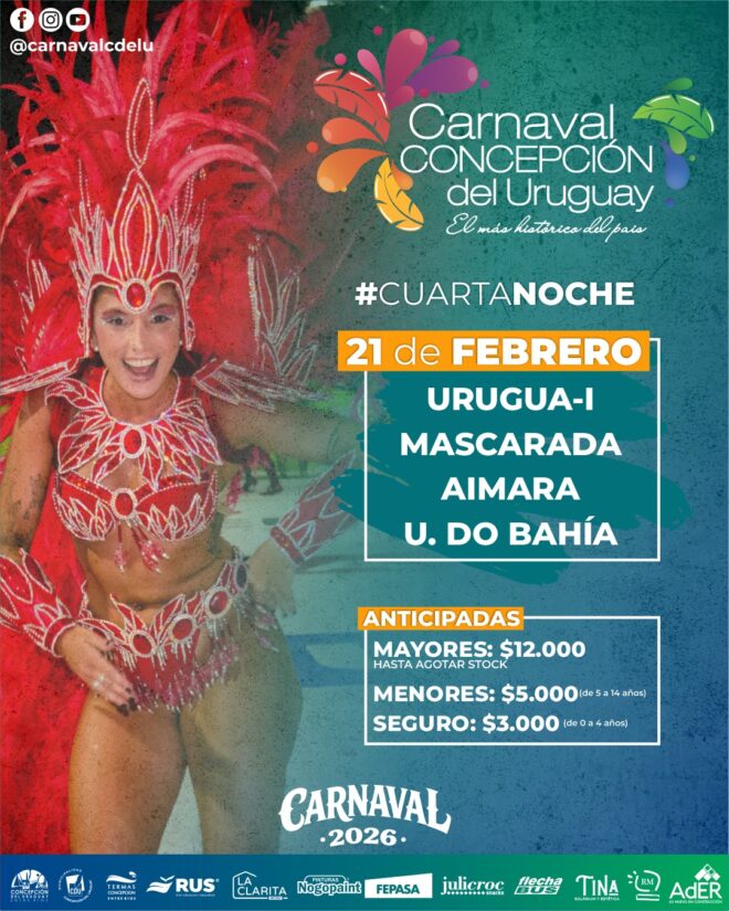 -TERMAS CONCEPCIÓN: Ruta 14 km 129. Piletas de aguas calientes y frías, jacuzzi, chorros descontracturantes, parque acuático. Alojamiento, restaurante, parador, instalaciones accesibilizadas. Entrada general 20000 pesos; residentes en Entre Ríos 150000 pesos; jubilados con carnet 15000 pesos; menores entre 4 a 12 años 15000 pesos. Menores 3 años no pagan ingreso. Estacionamiento 5000 pesos. Promoción de diciembre: 2x1 para residentes del departamento Uruguay. Horarios de piletas de lunes a viernes de 9 a 20; sábados, domingos y feriados de 9 a 21. Consultas por alojamiento 3442 473805.