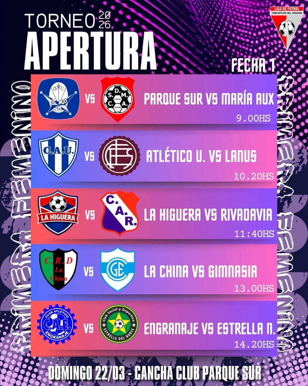 9: Estadio de Parque Sur “Marcos Comte” (Jordana y Defensa Sur). Fútbol femenino. Fecha 1.