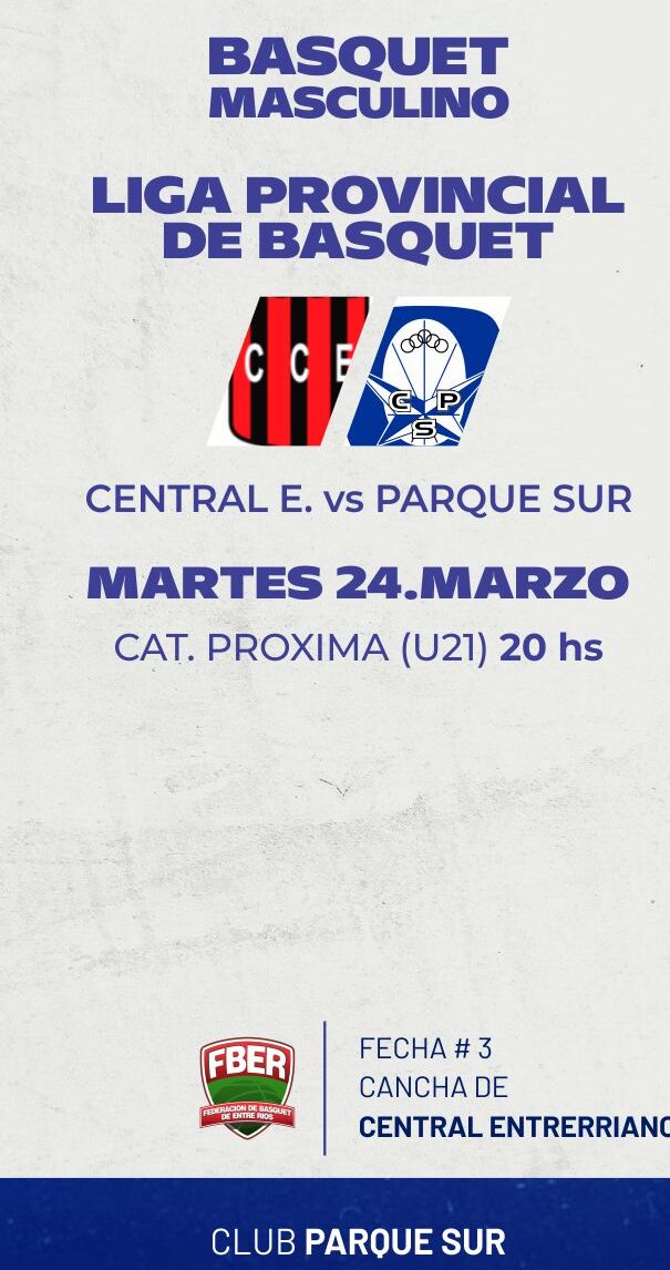 21:Estadio Julio César Paccagnella (Bulevard Yrigoyen 349). Liga provincial de básquet. Próximo (U21) Rocamora vs Atlético Tala.