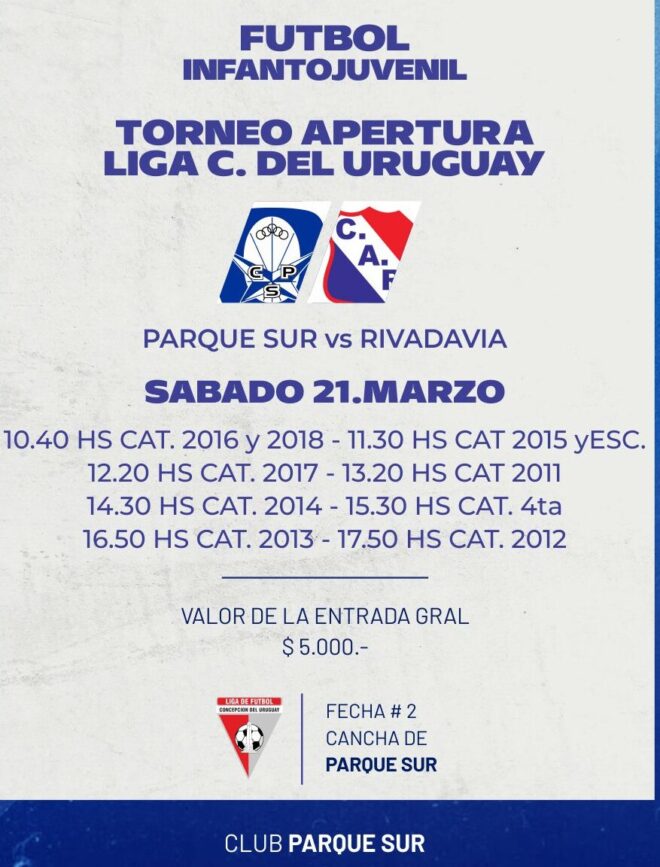 13: Estadio de Rivadavia “Raúl Cacho Andrilli” (Alfonsina Storni y Bourband). Fútbol masculino. Fecha 2. Primera B. Partidos: 13: La Higuera vs San Roque; 14.20: D.Muncipal vs San Martín; 15.40: Def. De Talita vs Boca Col. Elia; 17: San José vs Racing Pv; 18.20: Atlético C. Vs Sporting C. Libre: Deportivo Concepción.