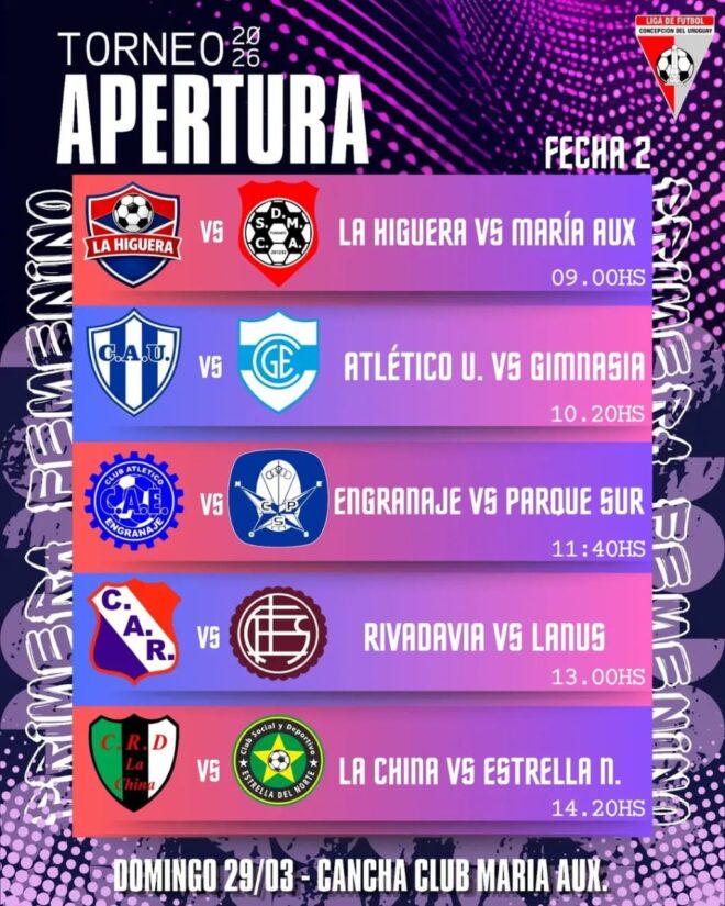 9: Sintético Municipal.Se disputará la fecha N°2 del Torneo Apertura 2026 en la categoría Damas. Reserva:Gimnasia y Esgrima vs Parque Sur.