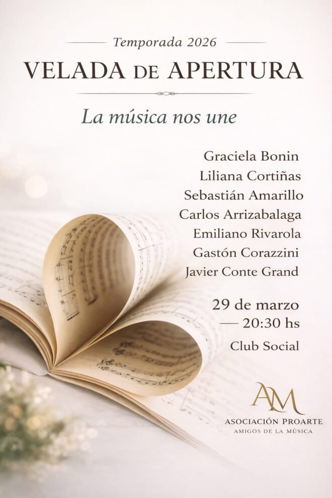 20.30: Club Social (San Martín 735).La Asociación Pro Arte Amigos de la Música inicia su Temporada 2026 con un Concierto a cargo de Graciela Bonin, Liliana Cortiñas, Sebastián Amarillo, Carlos Arrizabalaga, Javier Conte Grand, Gastón Corazzini y Emiliano Rivarola; todos destacados músicos locales. (Ver nota).