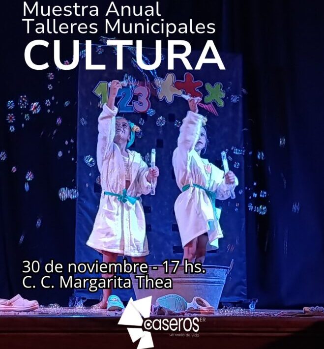 17: Centro Cultural “Margarita Thea” (Caseros-departamento Uruguay). Se desarrollará la Muestra Anual de los Talleres Municipales 2025. Participarán de esta muestra los talleres: Activamente, Recicleteando (porcelana fría), Las Tics y nosotros, Apoyo Escolar, Crochet, Arte Francés y Ajedrez con “Muestras Estáticas”; el Taller de Pastelería con Venta de Masas, Tortas y Postres; el Taller Creciendo en Movimiento con un circuito de actividades motoras; el Taller de Guitarra con una presentación musical; el Taller de Costura con Desfile de prendas confeccionadas; el Taller Jugando con la Tercera Edad con una coreografía; y el Taller de Teatro de Niños con la obra “El Reino de los Colores”.