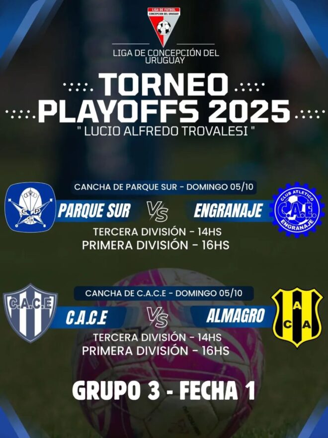 16: Estadio de Atlético “Simón Luciano Plazaola” (Tulipanes 700).Fútbol masculino de 1º. Torneo Playoffs 2025 "Lucio Alfredo Trovalesi". Grupo 2. Fecha 1. Atlético Uruguay vs Agrario Rocamora. La tercera juega a las 14.