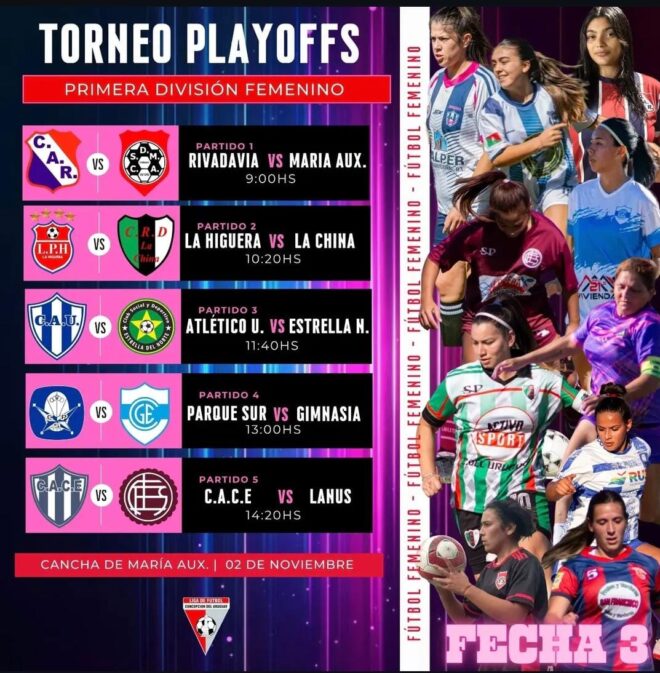 16.30: Torneo Playoffs 2025 "Lucio Alfredo Trovalesi". Fútbol masculino de 1º. Fecha 5.  Engranaje vs Almagro. La Tercera juega a las 14.30.