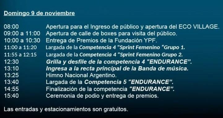 9: Autódromo. Prueba "Desafío ECO YPF". (Ver nota). Las entradas y estacionamientos son gratuitos.