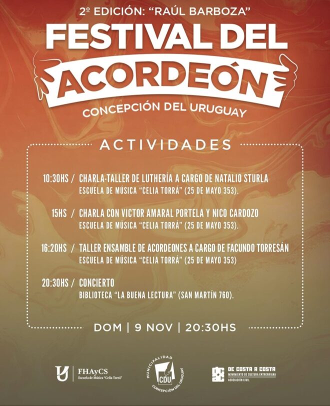 21: “La Enredada” (Francou 1548 de Villa Elisa-departamento Colón). Presentación de la obra de teatro "Al borde del andamio, vida y poesía de Amador". Amador Barria, albañil y poeta, vuelve a su casa de madrugada, pero su mujer no lo deja entrar, cansada de sus salidas y deslices. Parado frente a su puerta repasa su vida y reconstruye con palabras propias y ajenas las historias que lo construyen y lo vuelven quien es: historia de amor y de encuentro, de recuerdos y olvidos, de soledad y locura.