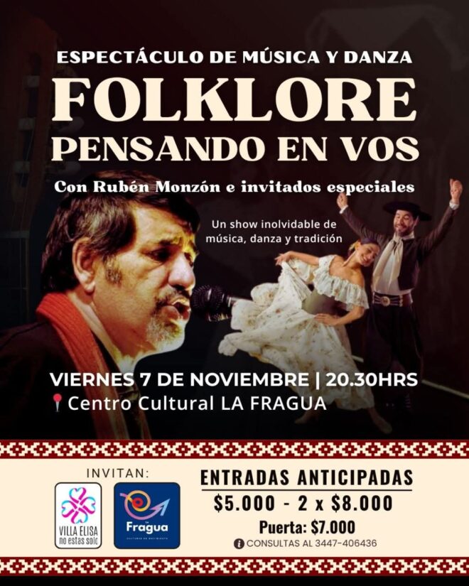 20: Plazoleta Manuel Belgrano Villa Elisa (Villa Elisa-departamento Colón). Festival de folclore. Danzas, música y baile popular, con servicio de cantina y comidas rápidas.