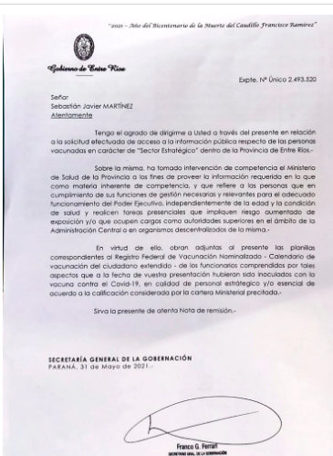Esta nómina, tomada del Registro Federal de Vacunación Nominalizada, fue entregada por el secretario general de la Gobernación, Franco Ferrari, al periodista Sebastián Martínez en respuesta a un pedido de información pública.