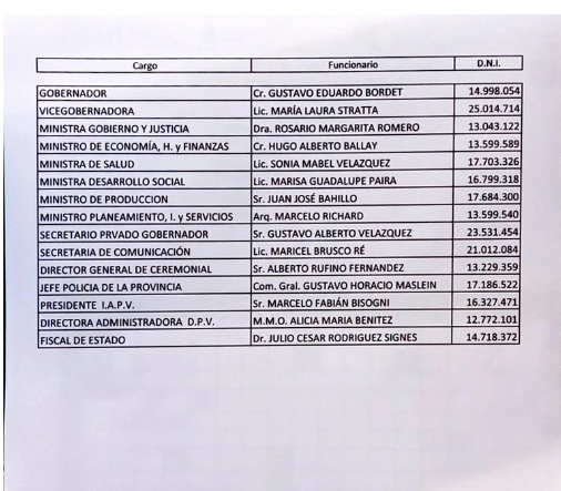 El listado no termina allí. También fueron considerados estratégicos y esenciales al jefe de Policía, comisario general Mario Maslein; el presidente del Instituto de la Vivienda, Marcelo Bisogni; la directora de Vialidad Provincial, Alicia Benítez; y el titular de la Fiscalía de Estado, Julio Rodríguez Signes.
