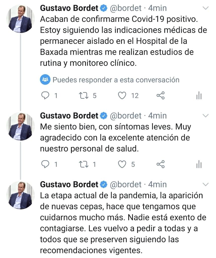"Acaban de confirmarme Covid-19 positivo. Estoy siguiendo las indicaciones médicas de permanecer aislado en el hospital de la Baxada mientras me realizan estudios de rutina y monitoreo clínico", dijo el gobernador de Entre Ríos, Gustavo Bordet, en las redes sociales.
