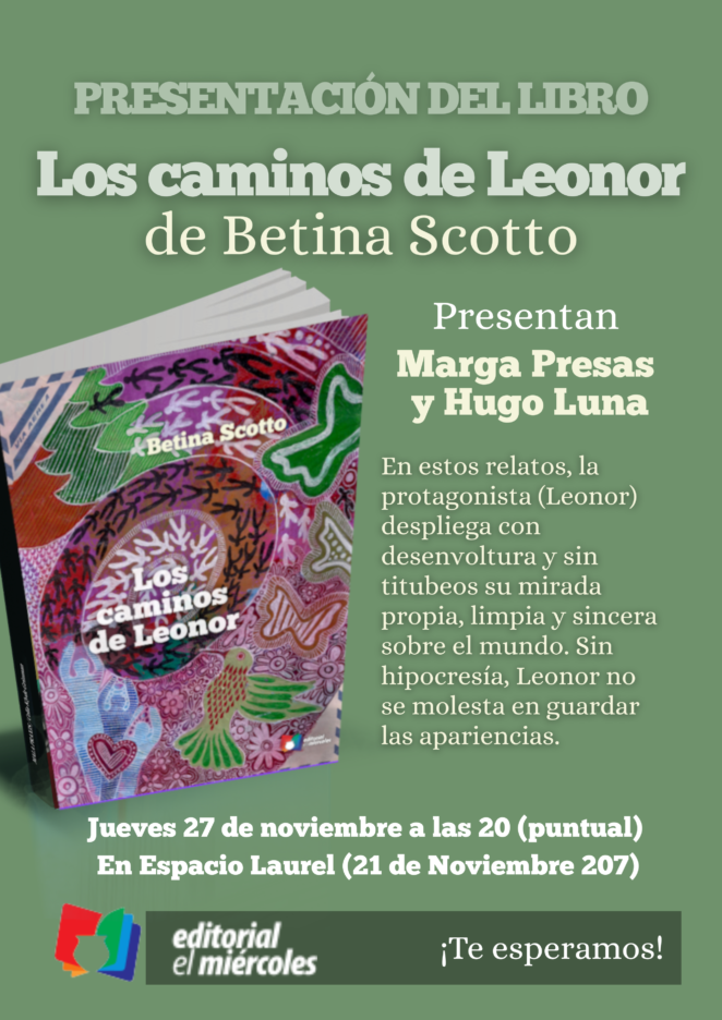 Este jueves 27 de noviembre será la presentación de la publicación “Los caminos de Leonor”, libro de relatos de la docente, periodista y escritora Betina Scotto. El trabajo fue publicado a través de la editorial cooperativa El Miércoles. Será en Espacio Laurel, desde las 20.