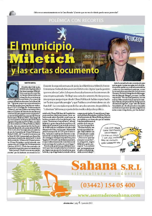 En esta nota de junio de 2013, en el mensuario El Miércoles se publicaba la denuncia de la entonces concejala Mónica Miletich sobre complicidades entre sus pares y funcionarios -de hasta los más altos cargos del Municipio- con una conocida empresa local para favorecerla y el posterior cruce de cartas documento entre el secretario de Obras Públicas del Municipio por aquella época, Mario Acuña, y la edila. Además, se reflejaba el tratamiento sesgado que hacían los medios de comunicación locales del poder ante la situación.