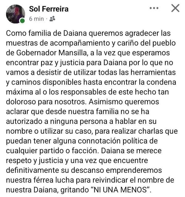 La familia de Daiana Mendieta realizó un comunicado para expresarse luego de que se conocieran detalles del caso de femicidio que conmociona a Entre Ríos y el país. La joven de Gobernador Mansilla, departamento Tala, tenía 22 años, desapareció el viernes 3 de octubre y fue hallada el martes 7 dentro de un aljibe en un camino vecinal conocido como Los Zorrinos, paralelo a Ruta 12.