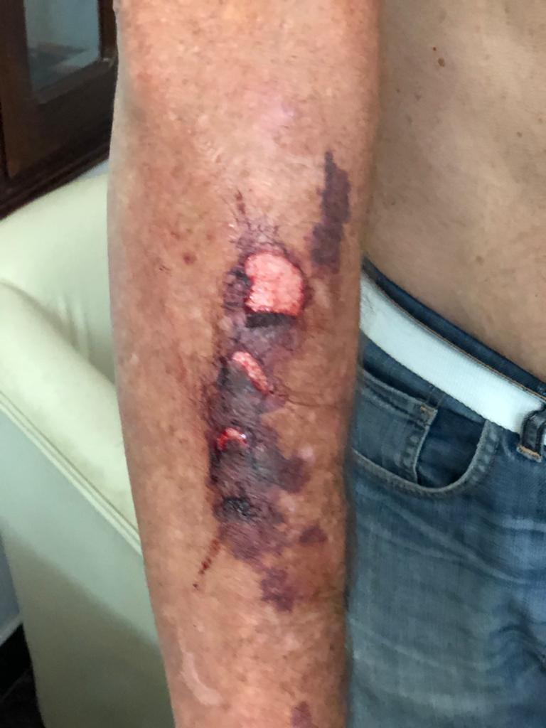 La reacción de Castrillón -según indicó su mujer- fue la que provocó que los dueños del kiosko llamaran a la Policía, pero antes habían golpeado violentamente al vocal, que incluso envió fotografías de cómo quedó uno de sus brazos, por la golpiza recibida.