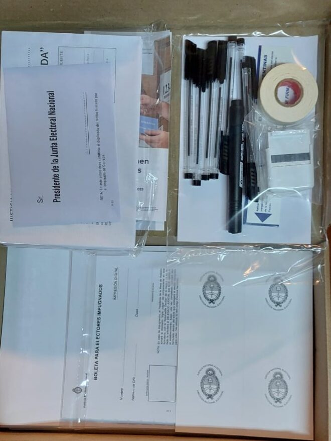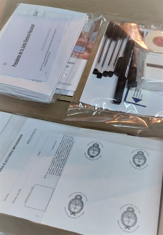 También se incorporan precintos, credenciales para las autoridades de mesa y una caja de útiles con bolígrafos indelebles, cinta adhesiva, fibrones, sellos, reglas, fajas de seguridad, normativa electoral y sobres para los distintos procedimientos previstos durante la jornada (boletas reemplazadas, votos recurridos e impugnaciones de identidad).