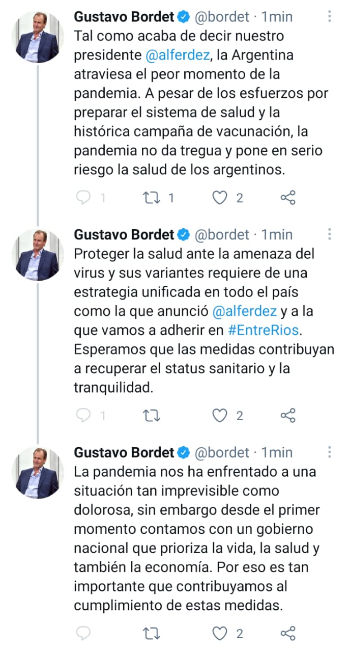 Previo a anunciar los detalles de las nuevas medidas, el jefe de Estado recordó: “A mediados de marzo anuncié que iba a llegar la segunda ola y, a mi pesar, tuve razón. Convoqué a los ciudadanos a redoblar todos los cuidados y tomamos restricciones que tuvieron un impacto positivo, pero hace unos días los casos comenzaron a aumentar en zonas del país. Algunas decisiones que debilitaron las acciones contundentes que propusimos para controlar la situación, algunas judicialmente avaladas”.