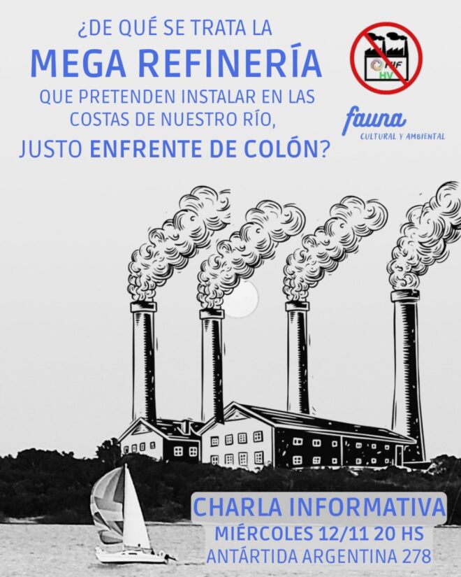 Este miércoles 12 de noviembre a las 20, habrá una reunión y charla  sobre la mega refinería de combustibles sintéticos que quieren instalar en Paysandú, justo enfrente de Colón y a la vera del río Uruguay.