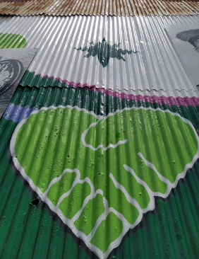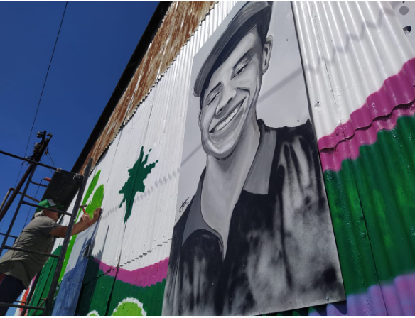 “Lo hicimos en dos etapas. Lo que son las cuatro imágenes en homenaje a Tomás las tuve que hacer aparte en mi casa, en otro tipo de chapa, una especial prepintada, porque no se podía hacer en esa chapa ondulada porque es difícil y el estado en que estaban, pintadas con agua con tiza, agujereadas, había pedazos de papeles de campañas políticas...”, explicó.