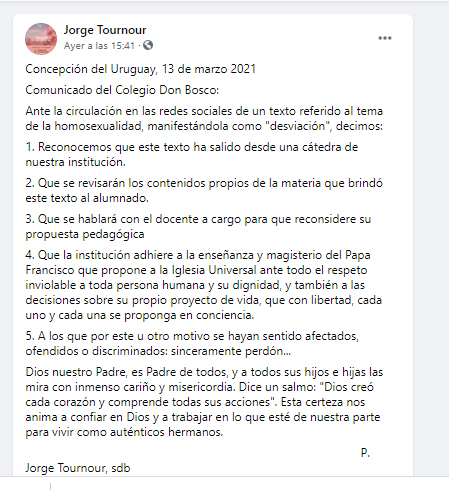 El texto se viraliza y el escándalo hace que el director de ese colegio, un sacerdote, responda pidiendo disculpas y aclarando que "la institución adhiere a la enseñanza y magisterio del Papa Francisco que propone el respeto inviolable a toda persona humana".