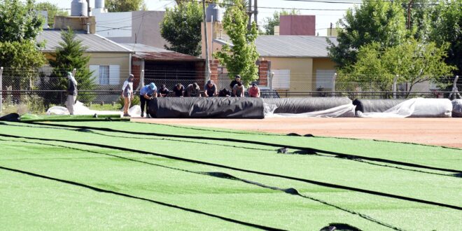 Sobre ese cimiento, personal de la empresa adjudicataria de los trabajos y empleados municipales procedieron -en las últimas horas- a colocar los 5.475 metros cuadrados de césped sintético, etapa que significa un paso fundamental para su uso.