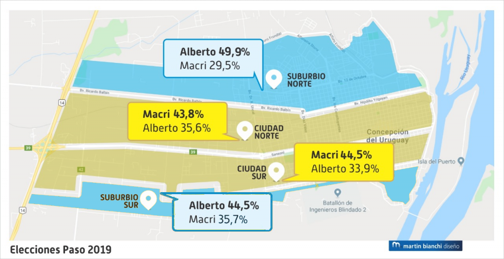 En Concepción del Uruguay los circuitos electorales son como cuatro franjas que atraviesan horizontalmente el casco urbano, como puede verse abajo, en el plano de la ciudad, desde la ruta al río. Si bien los circuitos electorales del ejido uruguayense son seis, los dos restantes (Santa Cándida y Colonia Perfección) corresponden a zonas periurbanas con escasa cantidad de votantes. Aunque no se los representa en los gráficos, en total votaron algo más de 1.000 personas y en ambos circuitos se impuso Macri con comodidad.