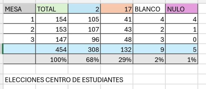 El “Frente UADER Entre Tod@s” se impuso al obtener el 68% de los votos válidos, lo que representa un total de 308 sufragios. La Lista 17 “Unión de Juventudes por el Socialismo” alcanzó el 29% de los votos, sumando 132 adhesiones. La jornada registró un total de 454 votos emitidos, de los cuales 2% fueron en blanco y 1% nulos.