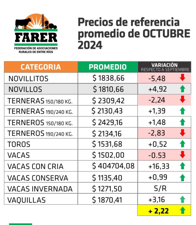 La Federación de Asociaciones Rurales de Entre Ríos (FARER) brindó los precios promedios arrojados por los distintos remates de hacienda en pie que tuvieron lugar en octubre en las instalaciones ferias de las rurales entrerrianas.